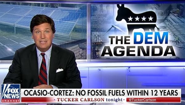Oh, but that scary Green New Deal means Alexandria Ocasio-Cortez wants to eliminate fossil fuels within a dozen years! (Carlson neglects to mention that's about all the time we have left to avoid climate catastrophe.) Obviously, it would be a disaster!!!