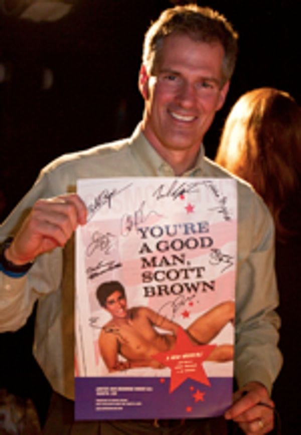 America's most poorly clothed senator, Scott "The Bush" Brown of the RomneyCare State, attended a pornographic play last nightabout his very own lifeat Boston's Improv Asylum last night. It was called "You're A Good Man, Scott Brown," just like in the cartoons. Was it funny? We don't know, ask someone from goddamn Boston! But someone did wave his balls in Scott Brown's face at some point.