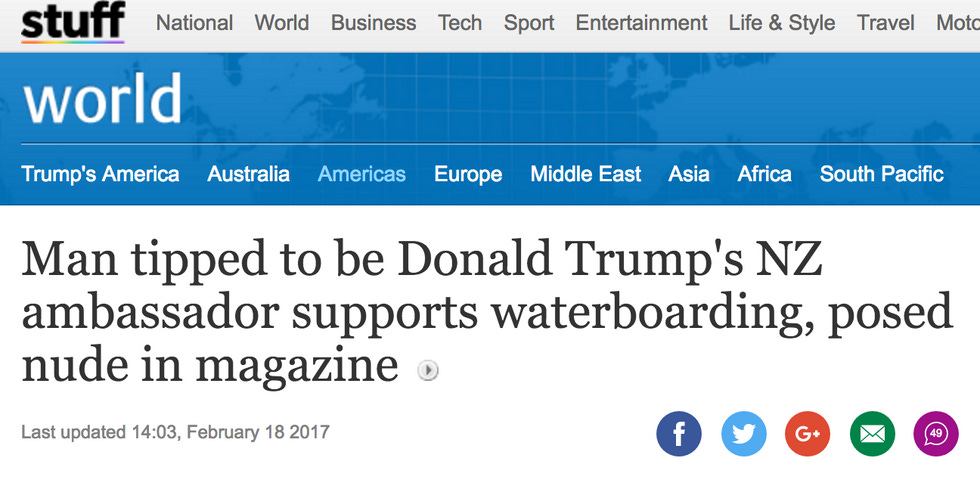 Anyway, Kiwis aren't dumb. Stuff , a reasonably popular NZ news site, introduced Kiwis to their new emissary from Trumpworld this way: