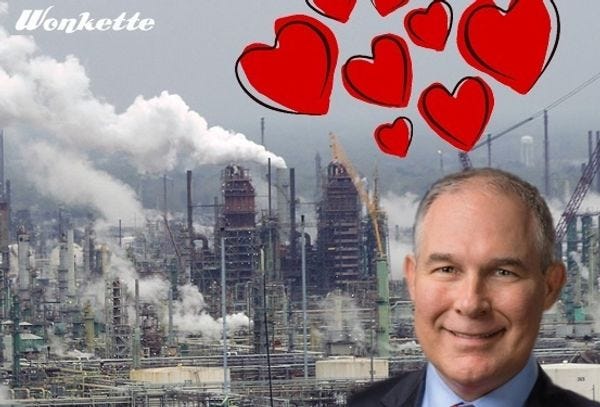 Also, too, NYT reporter Erip Lipton posted to Twitter yesterday a delightful trove of documents obtained from a Sierra Club FOIA lawsuit against EPA, showing some of the mash notes Pruitt sent to oil and gas company execs after he met with them early in his term. While the letters don't include any juicy admissions of evil, it's noteworthy that virtually all of Pruitt's communication was with people in industry, not with any groups concerned with "protecting" the "environment":
