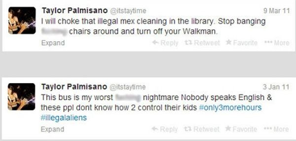 "I will choke that illegal mex cleaning in the library. Stop banging (expletive) chairs around and turn off your Walkman," she posted on March 9, 2011.