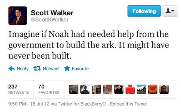 There are several hundred great responses to this on the Twitter, but Josh Barro's "The ark was never built" about takes care of it. Oh, what's that, angry responder, you heard about a piece of wood discovered at Mount Ararat, and you think that that is from Noah's animal boat? That was mostly just a piece of wood. In any event, we're glad to hear that the principled Scott Walker won't be offering a dime in government resources for disaster preparedness and response.