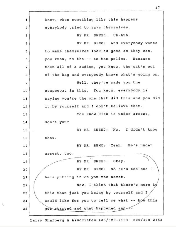 Bemo also, very weirdly, claimed that although he believed that Glossip had hired Sneed to kill Van Treese, Sneed only meant to rob Van Treese and killed him by accident when he got carried away.