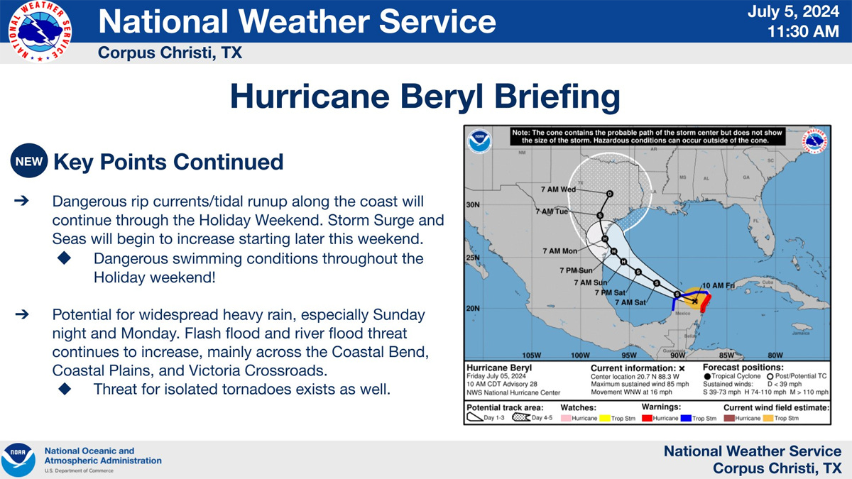 Beryl is now headed into the Gulf of Mexico, where warm water is expected to make it gain strength again, probably returning to hurricane strength before reaching land again Monday, most likely in southern Texas. Here’s the projected path from the National Weather Service on Friday: