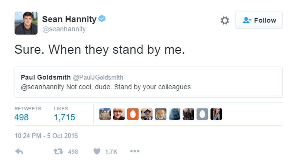 A bit later in the evening, some guy on Twitter was like "Hey bro. Not nice." So Hannity pulled the binky out of his mouth and said FINE, I'll be nice to her when she stops making fun of me, and then he cried some more probably:
