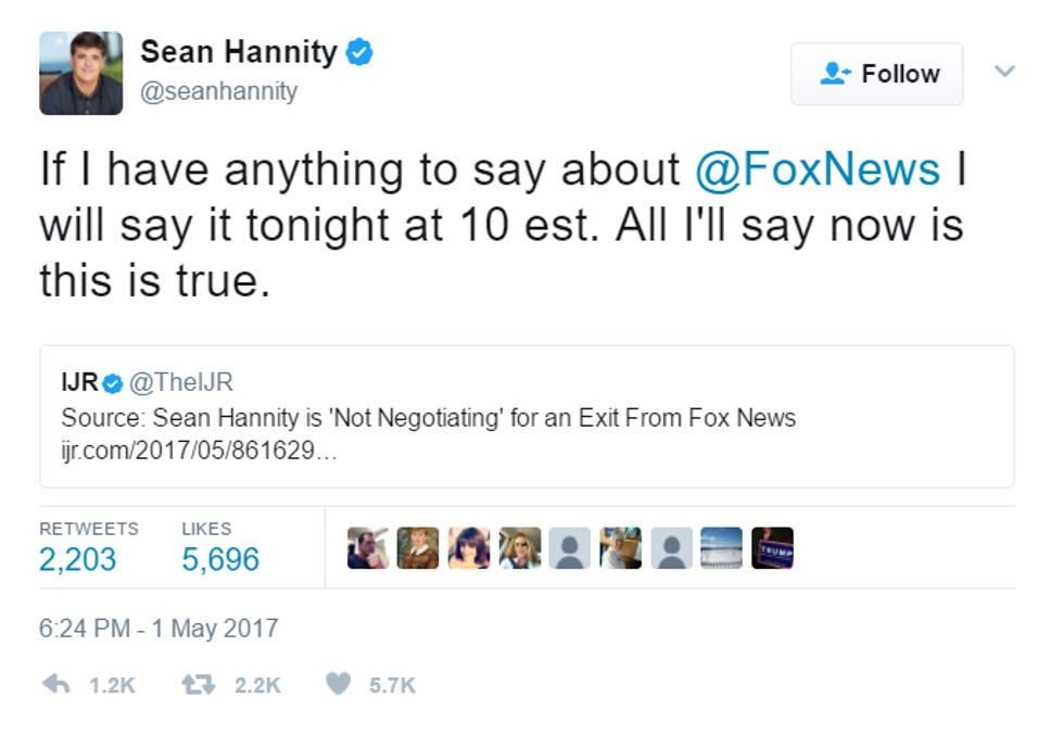 Aw fuck, Sean Hannity is NOT leaving? The tweet he quoted went to an article that said that, contrary to reports that Hannity's contract has a "key man" clause that says he gets to leave if Roger Ailes leaves, he is NOT leaving, so stop asking him. He will stay at Fox and work for that lady Suzanne Scott who got promoted when Shine's ass was shown the door, because PFFFFFFFFT.