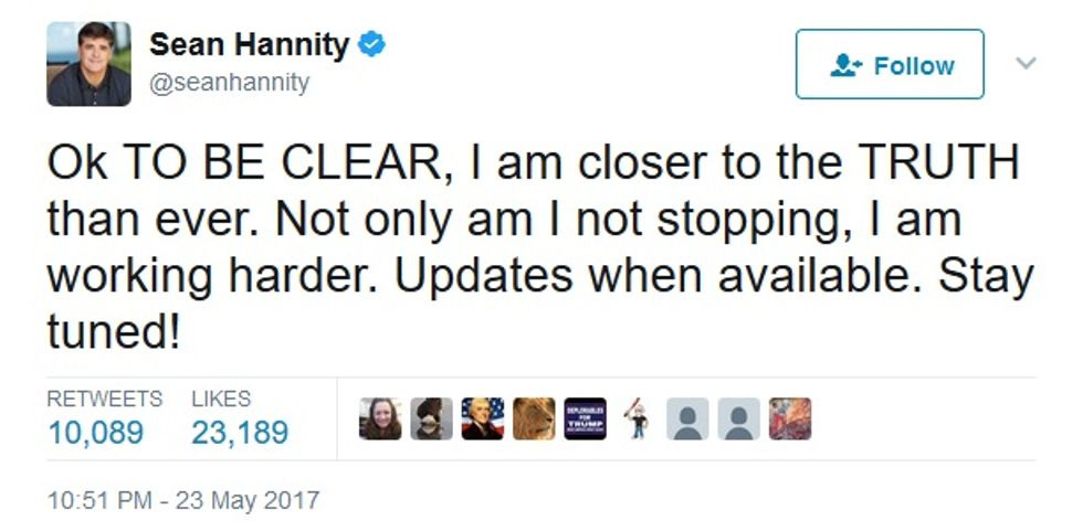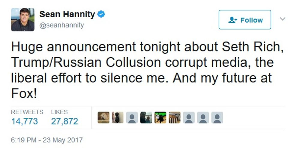 So, what earth-shaking news did Hannity have regarding Seth Rich and Hannity's own future at Fox? We almost missed it, since most of Tuesday's show was devoted to praising Donald Trump's tough Call Terrorists Losers response to the Manchester bombing. But by golly, Hannity did have an announcement!