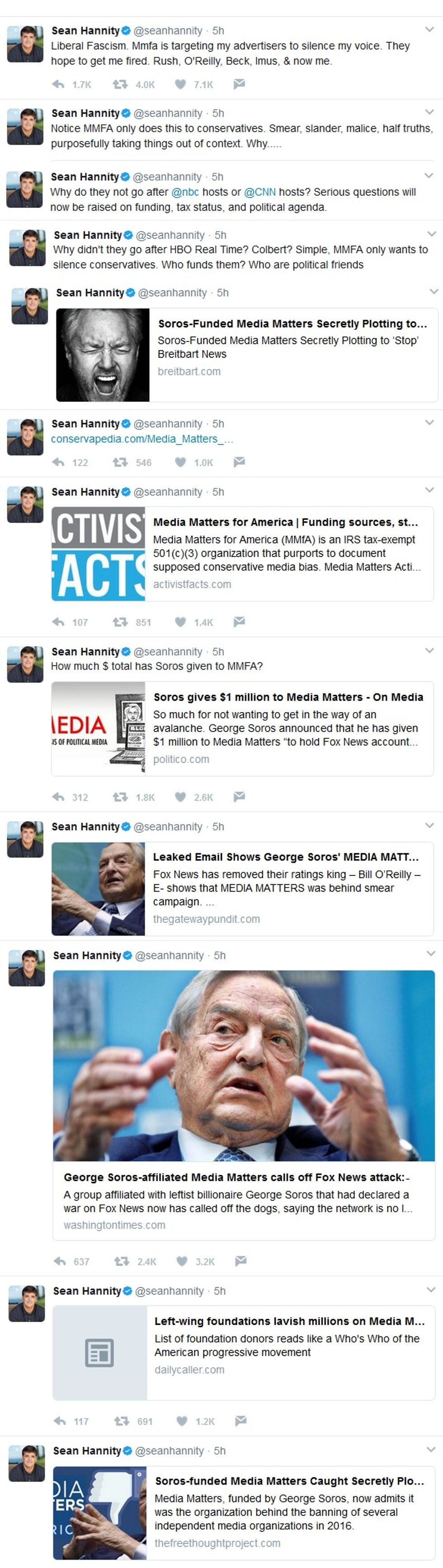 In conclusion, Sean Hannity told a lot of baseless lies about a murder victim to try to prove Russia never hacked the US election, then backed off (compassionately!) when it was apparent his story was collapsing, and now would like everyone to know George Soros, David Brock, and Media Matters for America are the real bad guys because they keep pointing out what a liar Sean Hannity is, the end.