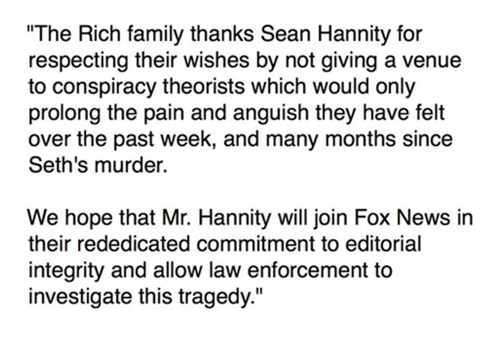The Rich family, through a spokesperson, issued a statement thanking Hannity for shutting up at long last, with a hint that maybe he should stay that way:
