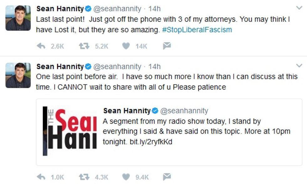 On Twitter, Hannity hyped the huge news he was going to reveal in Tuesday night's show:
