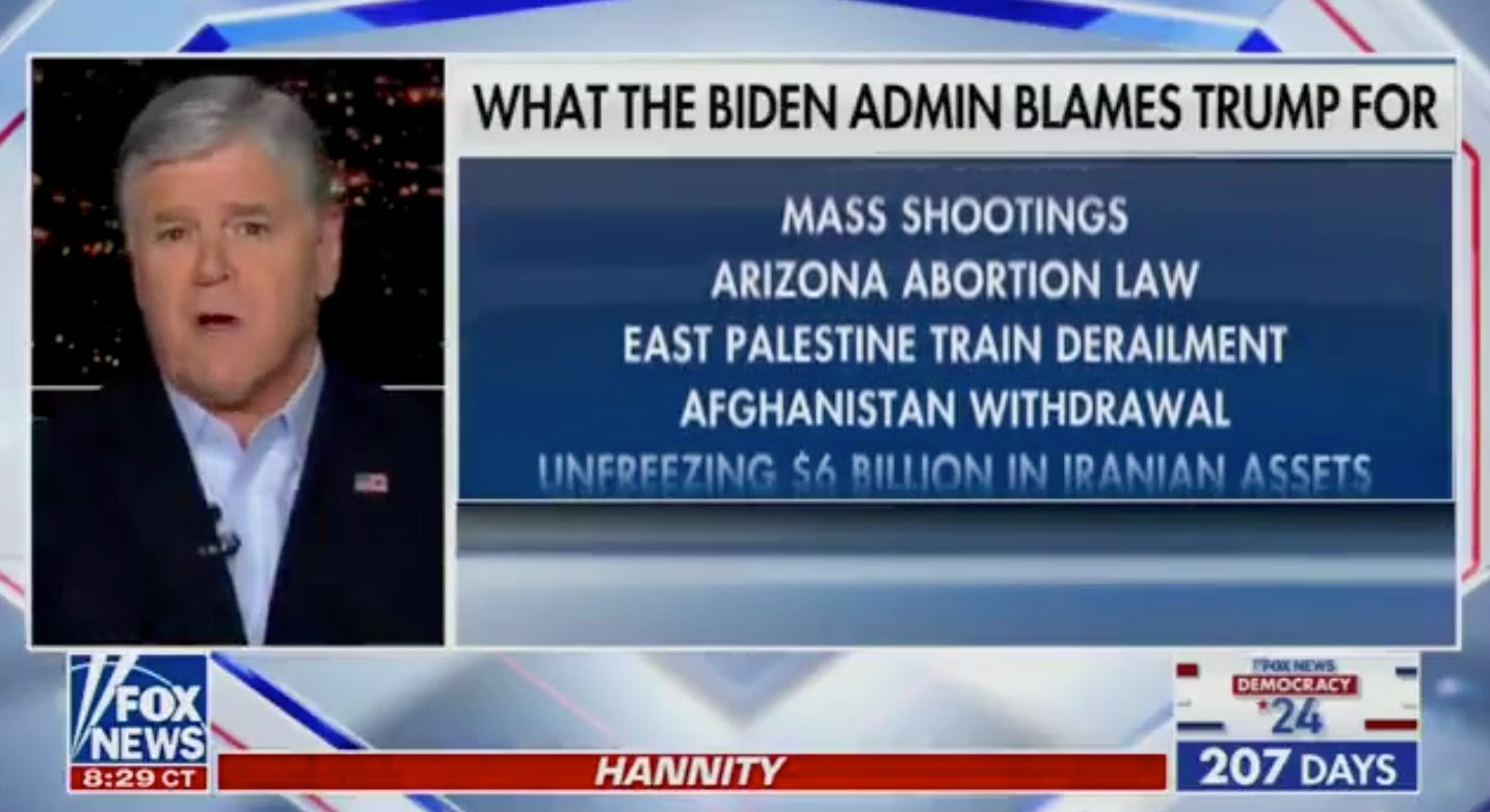 Here is Hannity on his show last night, panicking and pissed off, his voice nearly breaking, about all the things the Biden administration blames Trump for. One of them — “this is pretty humorous,” he says — is the Arizona abortion law! Oh, he is so mad/sad/losing his fucking marbles right now.