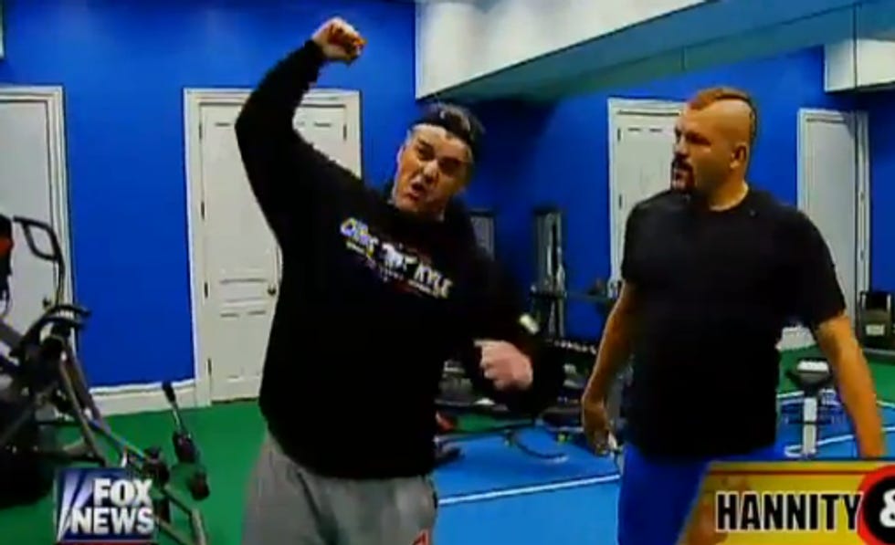 Sean Hannity has been doing MMA training for a few months now to get into shape, and tonight he showed off some behind-the-scenes footage of his actual workout, alongside UFC champ Chuck Liddell.