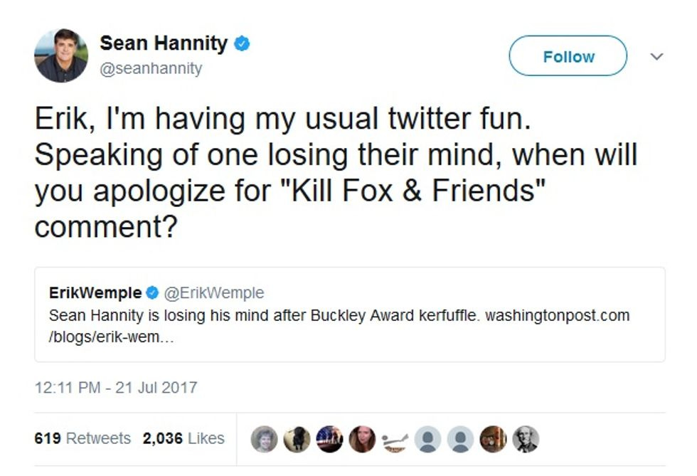 Sean Hanity is not losing his mind. He is having fun. YOU'RE LOSING YOUR MIND, ERIK WEMPLE! YOU WANT TO MURDER THE ENTIRE CAST OF A FOX SHOW!