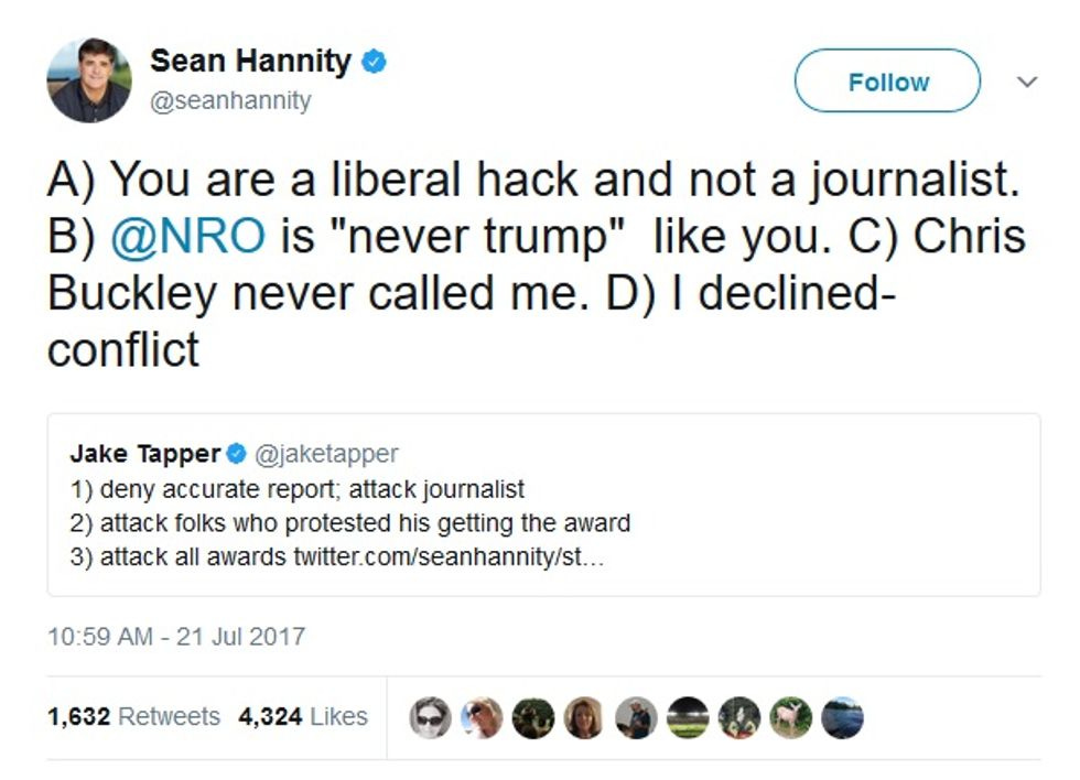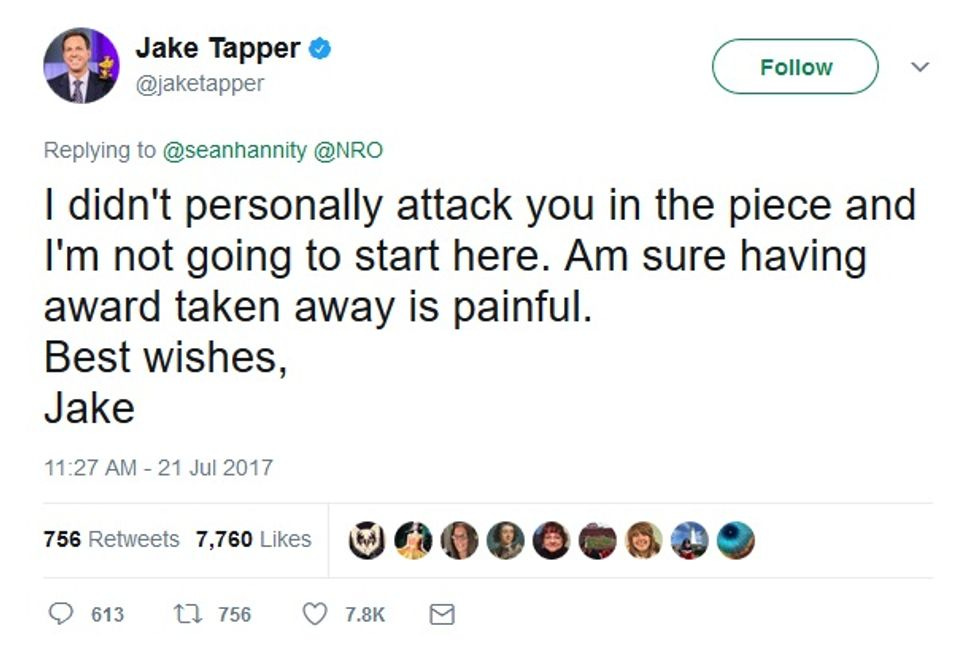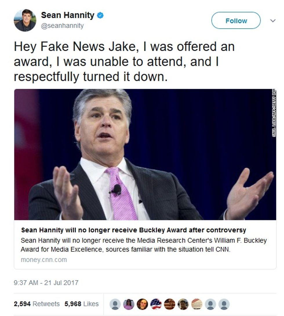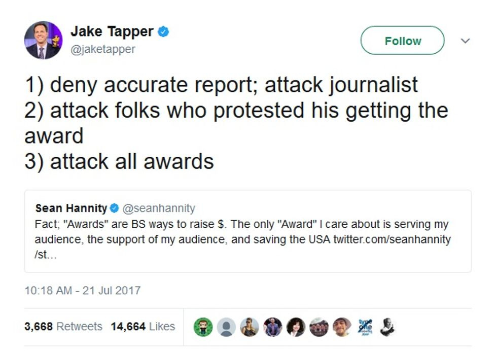 No, Jake Tapper, you cannot just leave and say the award was rescinded! Hannity must yell at you more! Also, SCHEDULING CONFLICT! Hannity happens to know that Jake Tapper COLLUDED with the DNC prior to interviews, because Wikileaks!!!!!!!
