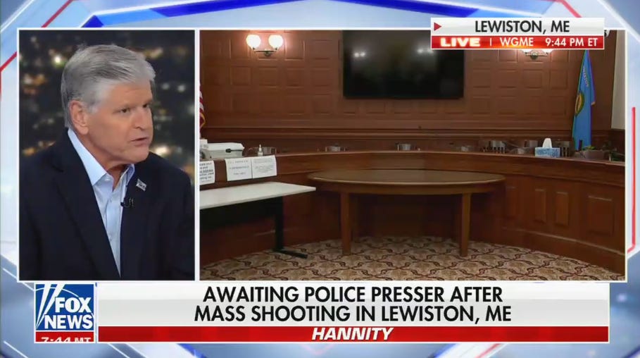 During the breaking news reporting on the dreadful godawful latest American mass shooting on Wednesday night in Lewiston, Maine, Sean Hannity thought it would be a good time to talk about his MMA. So he did.
