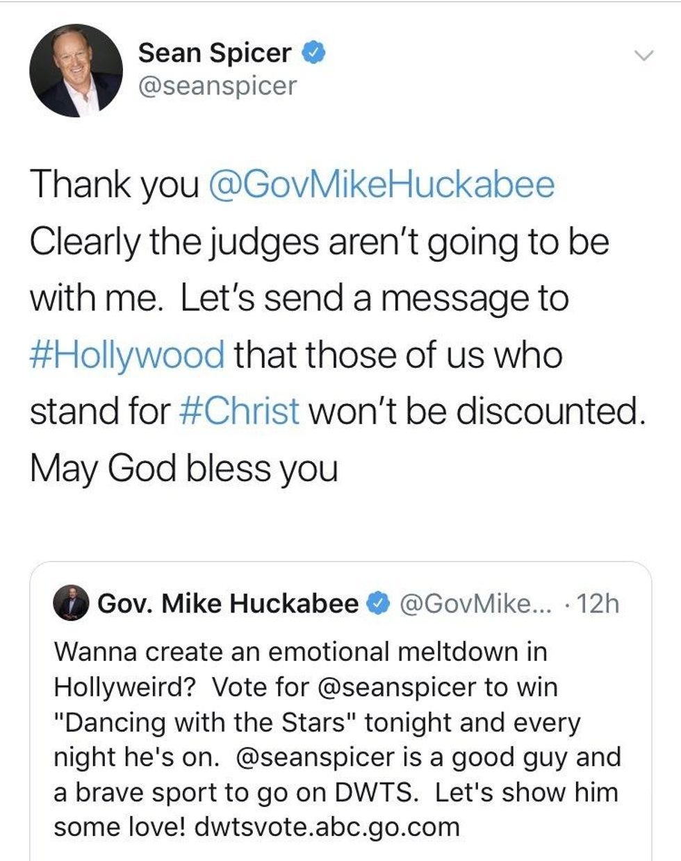 But instead of wishing to be judged by the audience at home for his salsa skills alone, Spicer and his buddy Mike Huckabee — father of his replacement at the White House, Sarah Huckabee Sanders — have decided to turn this reality show into a ridiculous culture war thing and would like people to vote for him not because he deserves it, but because it is what Jesus wants and because it will piss off "Hollyweird." Sort of like affirmative action, but for rich white Republican men!
