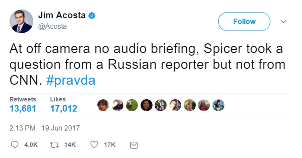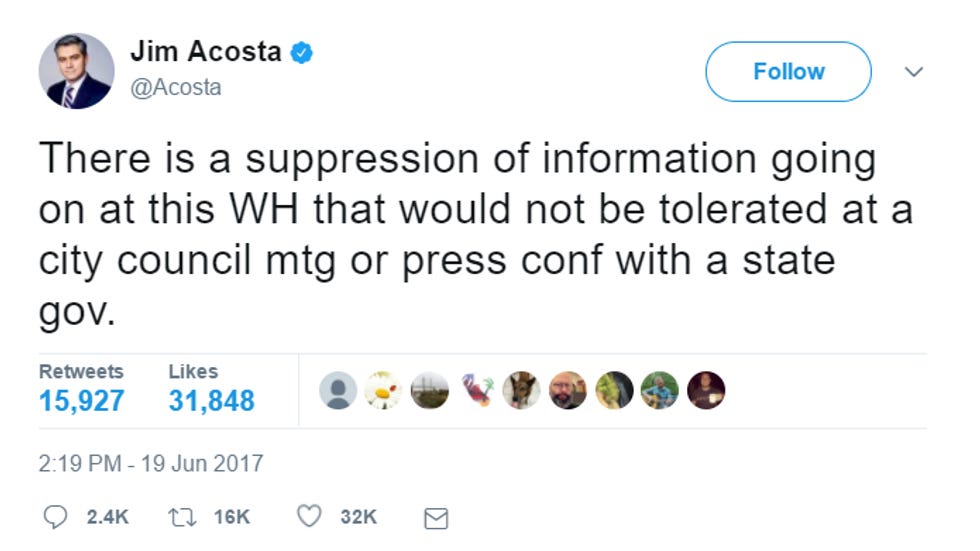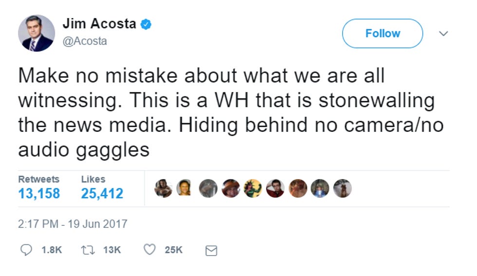 On Monday, CNN reporter Jim Acosta lost his shit when informed that Spicer would be doing a press "gaggle," but that no audio or video was allowed. Acosta tweeted several things that happened during the briefing, like for instance that Trump is STILL being a stupid baby about whether or not he has "tapes" of James Comey, because he's not man enough to admit that his "tapes" tweet was just impotent bluster. He also commented on what's really going on with press access in the White House: