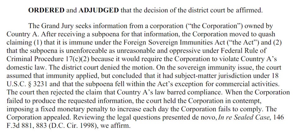 OK, so we have "the Corporation," and it is "owned by Country A." And the court is not buying the argument that it would be against Country A's laws for the Corporation to comply with this subpoena. To that end, the corporation/country has already been held in contempt, and in this filing, we see that Robert Mueller (if it is indeed Mueller!) has won this latest round.