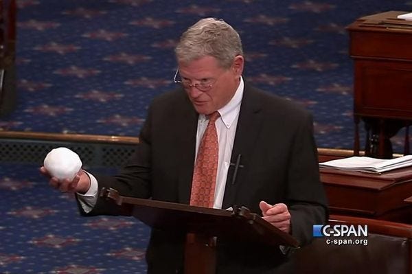 Inhofe has been in Congress since he was elected to the House in 1986; he successfully ran for the Senate as part of the 1994 Republican wave that brought us House Speaker Newt Gingrich, the Contract on America, and the total Luntzification of American political discourse. He's been an absolute asshole on environmental issues; as the Washington Post reminds us, he wrote a book-shaped object in 2012 with the title The Greatest Hoax: How the Global Warming Conspiracy Threatens Your Future, from that most reliable publisher, WND Books, so you know it was very accurate. (Big surprise: A contemporary review noted that Inhofe's own belief that climate change is a hoax was based on a "scientific" paper that was itself completely fraudulent. )