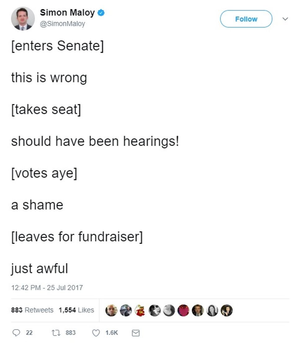 Democratic senators, who are definitely not voting for the thing, are mostly saying they're dumbfounded that the Senate is really doing this: