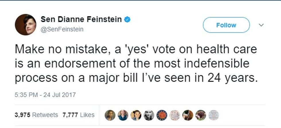 As of this moment, Maine's Susan Collins remains the only senator who says she's unalterably opposed to whatever the hell the vote is on, because none of the options that have been discussed will protect Medicaid. The rest could probably be persuaded, as long as McConnell, Trump, and Pence promise they won't be primaried. At least one of the Republican senators who had previously said the first version of the Senate bill cut Medicaid too much, Nevada's Dean Heller, has reportedly said he's on board with the motion to proceed, whatever is being proceeded to. Rand Paul, apparently under the impression the bill will be a straight repeal of the ACA with no replacement, is also reportedly a "yes."