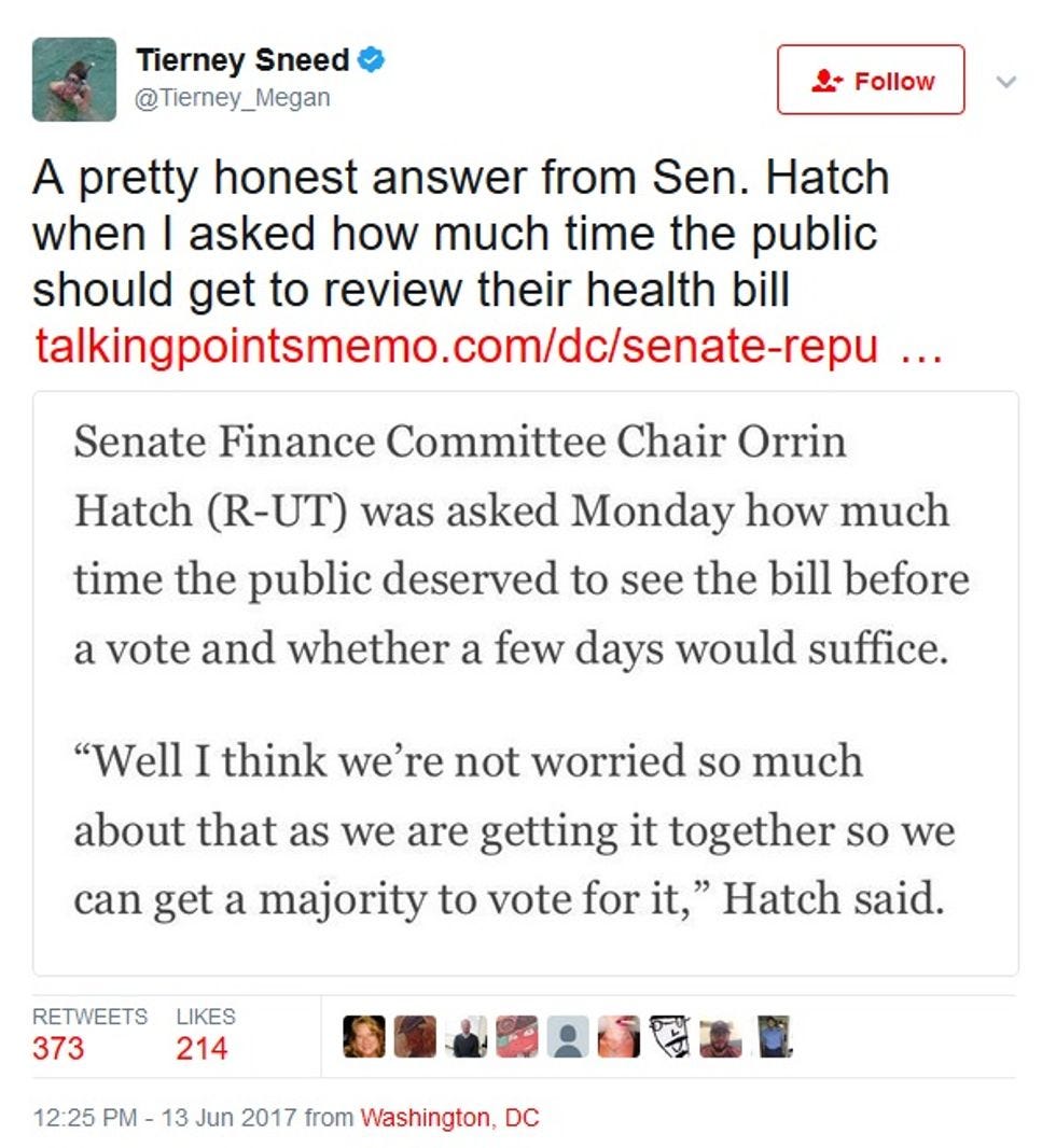Wonder where they'd get a ridiculous conspiracy theory like that? Oh, maybe from Orrin Hatch, who explained Senate Republicans aren't primarily concerned with whether the public sees the healthcare abomination they're working on: