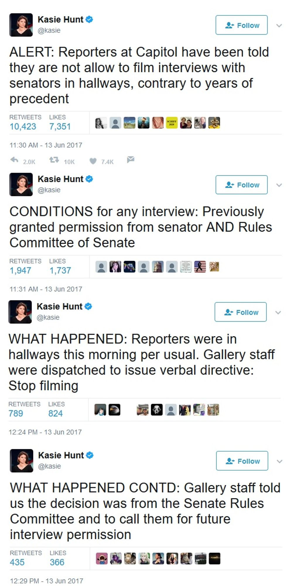 Reporters were told they would no longer be allowed to film or record audio of interviews in the Senate side hallways of the Capitol without special permission.