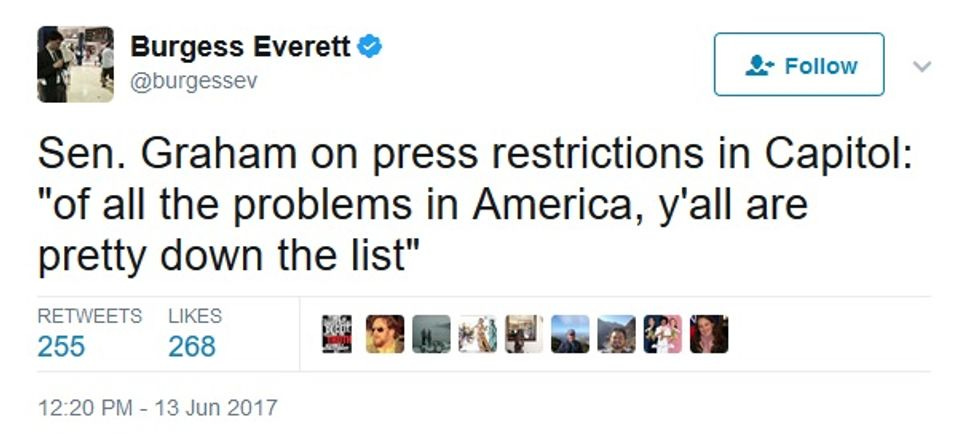 Gosh, this isn't disturbing at all, is it? Needless to say, Senate Republicans took the restrictions on the press in public areas of a government building (isn't there some law mentioning that stuff?) with all the seriousness you'd expect. Politico reporter Burgess Everett got this steadfast defense of the First Amendment from Lindsey Graham:
