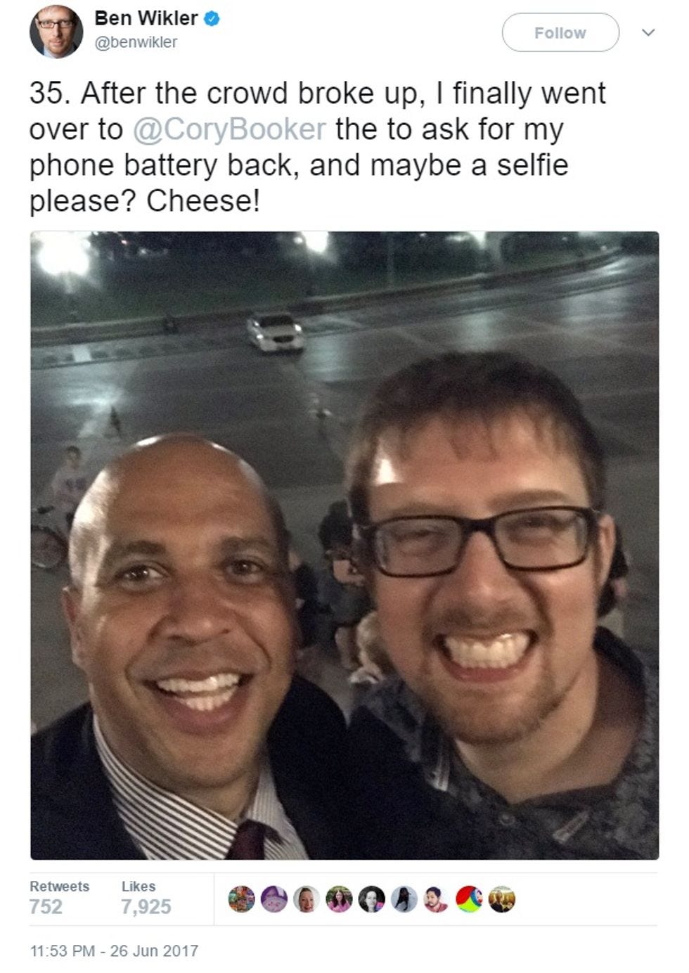 Also, when Monday's impromptu rally ended, Wikler got his iPhone battery back from Cory Booker. And took a selfie, of course:
