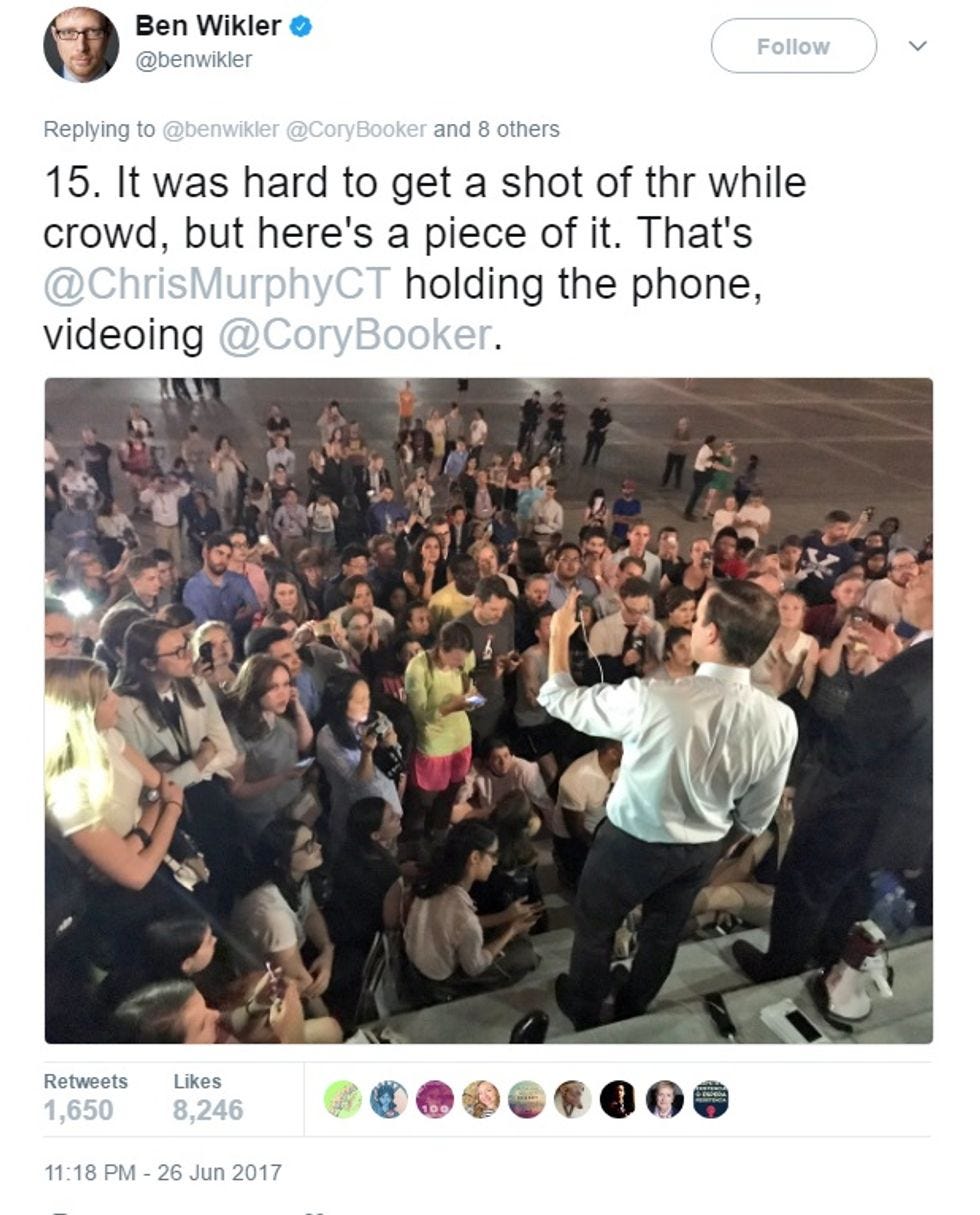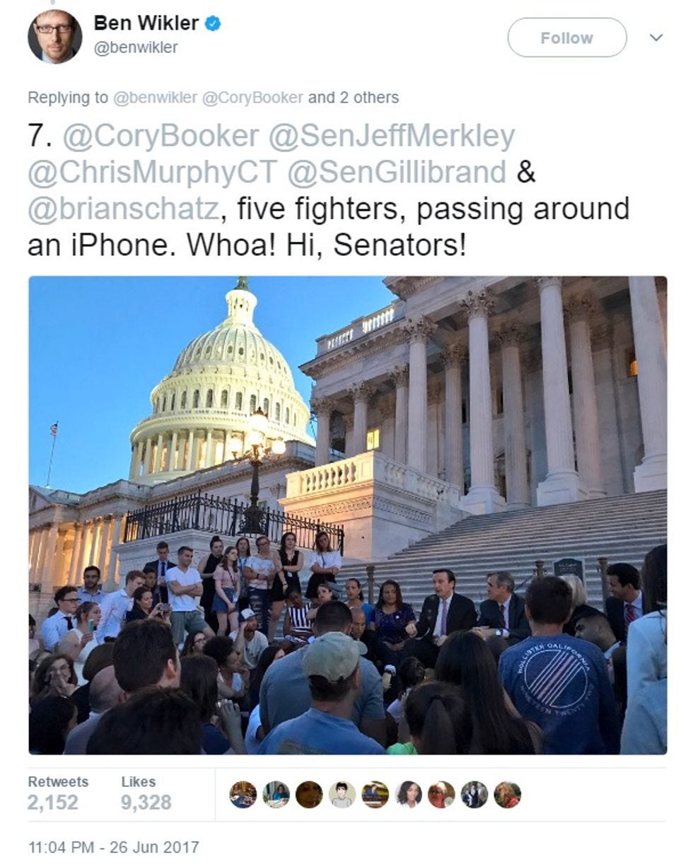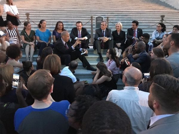 Wikler was actually on Capitol Hill for other business when he got a text telling him to go check out what was happening on the steps of the Senate: a good old-fashioned hippie teach-in by a bunch of liberal senators, who came out to join Booker and Lewis after their turns on the floor: