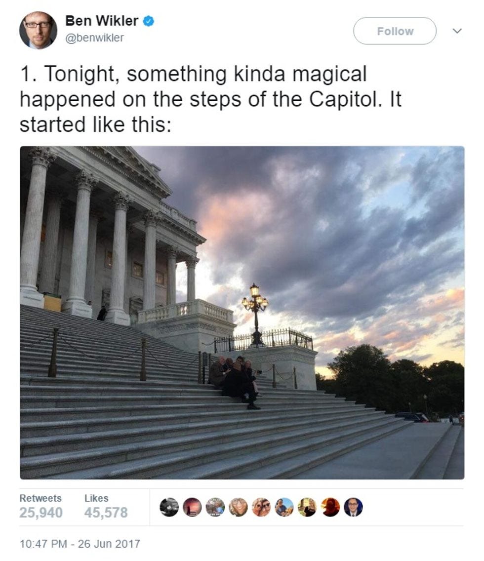 Kids, if you want to counteract that suspicion that the USA has become a hopeless Crapsack Dystopia, go read this nifty Twitter thread by Ben Wikler, the Washington director for MoveOn. It's about a Cool Thing That Happened on the steps of the U.S. Capitol Monday night after New Jersey Senator Cory Booker and actual national treasure Rep. John Lewis sat down to do a Facebook Live stream about Democratic opposition to the Republicans' plan to kill Obamacare. It started off pretty small, just the two of them talking policy like a couple of policy nerds while inside the Senate, Dems held the floor in another talkathon against the Better Not Expect Republicans To Care plan: