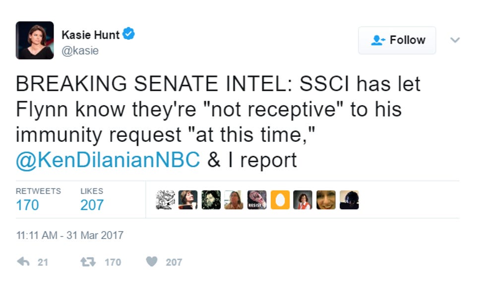 NBC's Bradd Jaffy also tweets that the Senate intel committee finds Flynn's request "wildly preliminary," because good gracious, they JUST started investigating.