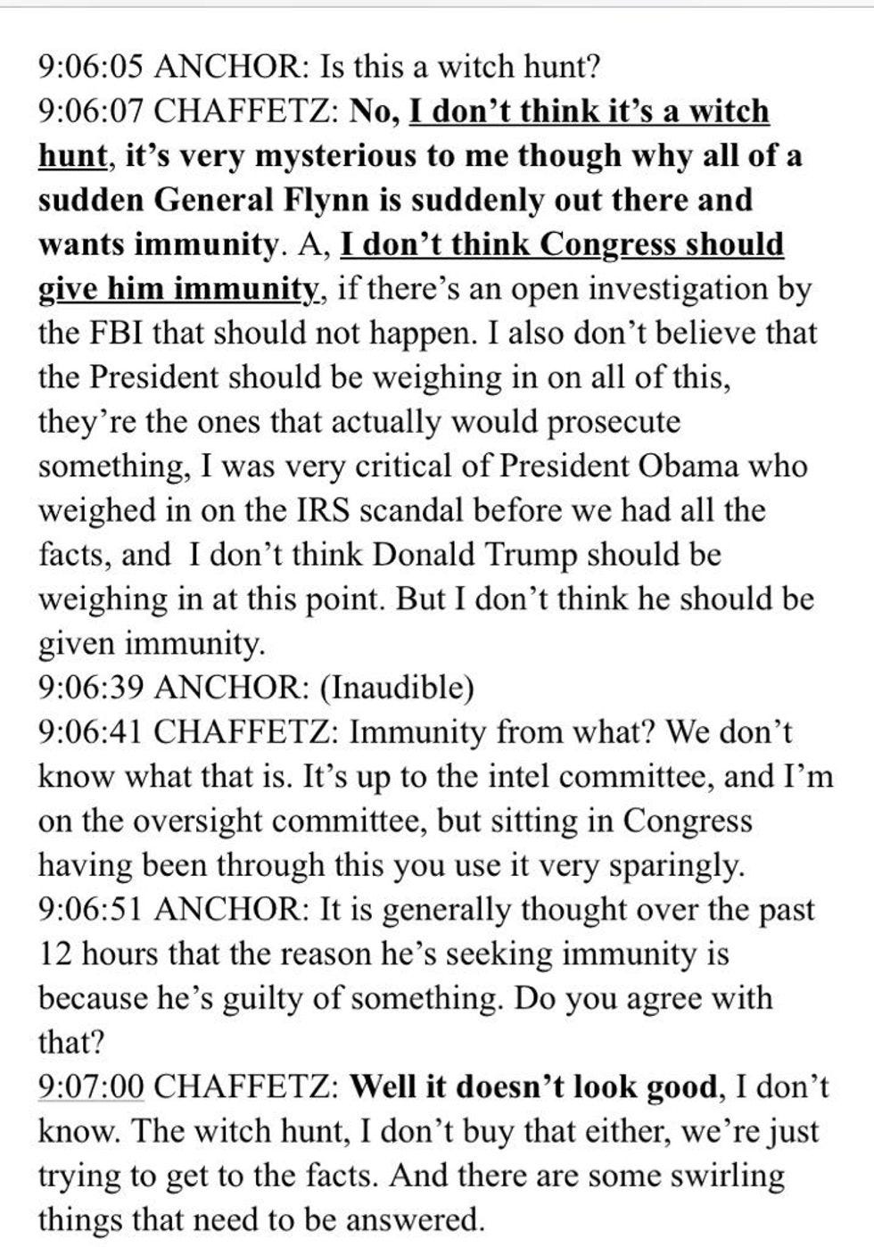 For another reaction to Flynn's request, we now go to flaming smegma lump Rep. Jason Chaffetz, who is not on the Intelligence committee, but is on the Oversight committee. We don't know how to say this, but we think Chaffetz is right about a thing. He said on Fox News this morning that Congress should not give Flynn immunity, and moreover, he said Donald Trump needs to STFU with his tweets about it. As to whether this means Flynn is probably guilty of all the things, Chaffetz said, "It doesn't look good," and says Flynn is not a victim of a "witch hunt." Here's a clip of that, along with the transcript, shared on Twitter by MSNBC's Katy Tur: