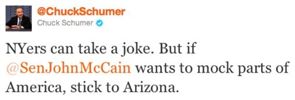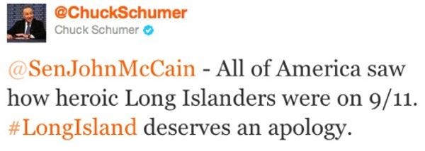 Uh-oh, why is John McCain insulting 9/11? Don't tell us our favorite celebrity political couple John McCain and 9/11 have finally broken up! (Calm down, Lindsey Graham, that is not actually what happened.) No, John McCain jokingly insulted Long Island during a Senate debate by saying that it is "regrettably" part of America, and Chuck Schumer freaked out but could not think of one single nice thing about Long Island to say in its defense on Twitter except that there were people heroically inhabiting Long Island when 9/11 happened. This more or less proves the Walnuts point correct (hooray, he finally got one right after 19 million years in the Senate!), but no way did the fun stop there.