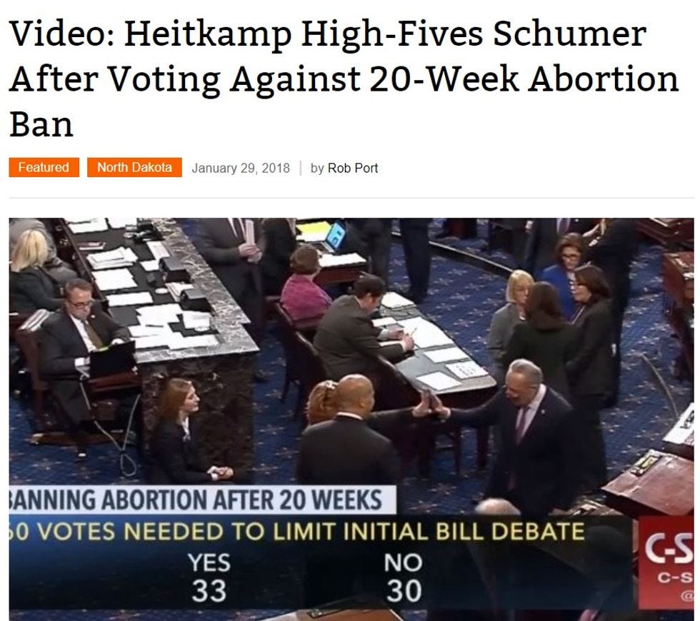 In one of the stupidest rightwing attempts at a smear that we've seen thismonth weekmorning, we learned while prepping today that back in January a North Dakota political blog offered this really stupid headline and still image suggesting that Heitkamp just looooooves aborting little babbies! The image was taken from CSPAN during voting on the GOP bill to ban abortions after 20 weeks, which failed to get enough votes to get past a filibuster.