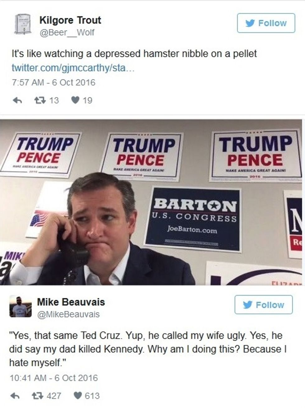 Still remaining to be seen: whether Donald Trump will campaign for the guy he called "Lyin' Ted" (even Trump gets things right now and then), and if he does, whether Trump's grudging support will help or hurt the lying little weaselboy. Either way, expect that video of Sad Ted Cruz trying to choke back tears while campaigning for Trump to resurface a lot this fall.