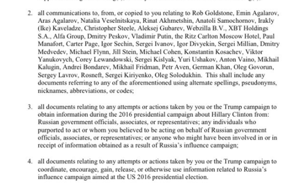 That's broad! The first five names are from Junior's meeting. Alfa Group is the Russian bank that weird Trump organization server constantly communicated with. (Some people think that story was "debunked." It was not.) The Ritz Carlton in Moscow is where Donald Trump allegedly almost sexually drowned in Russian hooker pee. Then you see creep Trump thugs like Carter Page, Trump lawyer Michael "SAYS WHO?" Cohen, Corey Lewandowski, Michael Flynn and ... JILL FUCKING STEIN? Either they simply want documents related to everybody who got their picture made in Moscow at that RT gala in 2015 (remember, Stein sat at the table with Putin and Flynn), or her name is included because they've seen classified intelligence that suggests that Stein is #complicit. (We would not be surprised, to which the Editrix would like to add FUCKING CALLED IT.)