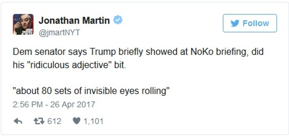 Hey, we can all stop worrying about Donald Trump doing a first strike on North Korea: Wednesday's big briefing for the entire Senate on the White House grounds (the Eisenhower Executive Office Building, actually) turned out to be little more than an exciting photo op for the Trump administration. There was no reason at all to pile almost all of the members of the Senate into a couple of buses and take them down Pennsylvania Avenue; the briefing could have just as well been held in a secure Senate room. But without the theatrics, why would anyone have paid much attention to it? Finally, we have bipartisan agreement on something: This Very Important briefing was no great shakes.