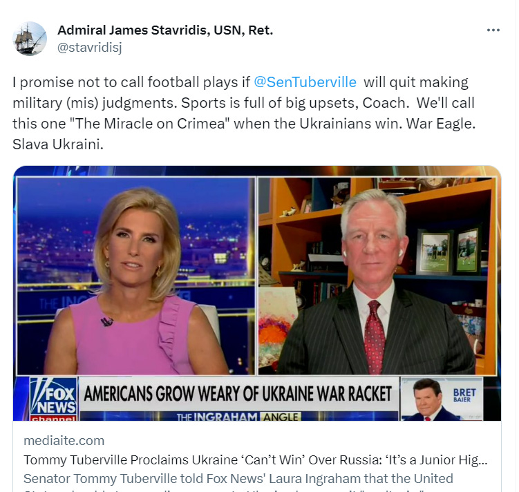 “I promise not to call football plays if @SenTuberville will quit making military (mis) judgments. Sports is full of big upsets, Coach. We'll call this one ‘The Miracle on Crimea’ when the Ukrainians win. War Eagle. Slava Ukraini.”