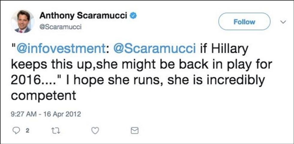 Yes, that Anthony Scaramucci. We'd been wondering a while (okay, since Friday, when we first heard of him, because we do not watch "news" on tv) if he was actually some sort of Hillary Clinton mole. I mean LOOK:
