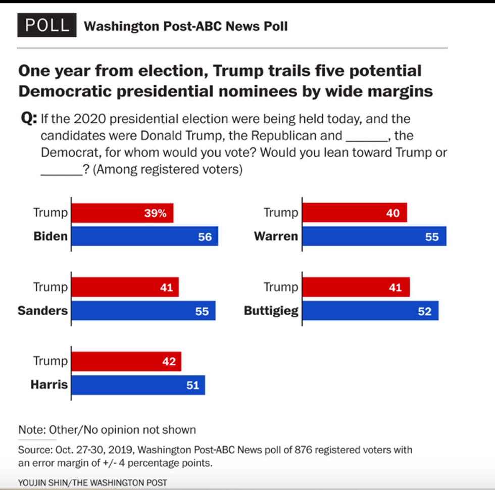 The Washington Post released its own poll today, and all the top Democrats are beating Trump silly. There appears no immediate advantage in selecting the "slow and steady, tortoise-style" candidate. If that's what you want, vote the hell out of it, I say, but you might have to convince people to support your candidate without using the words "electable" or "swing voters."