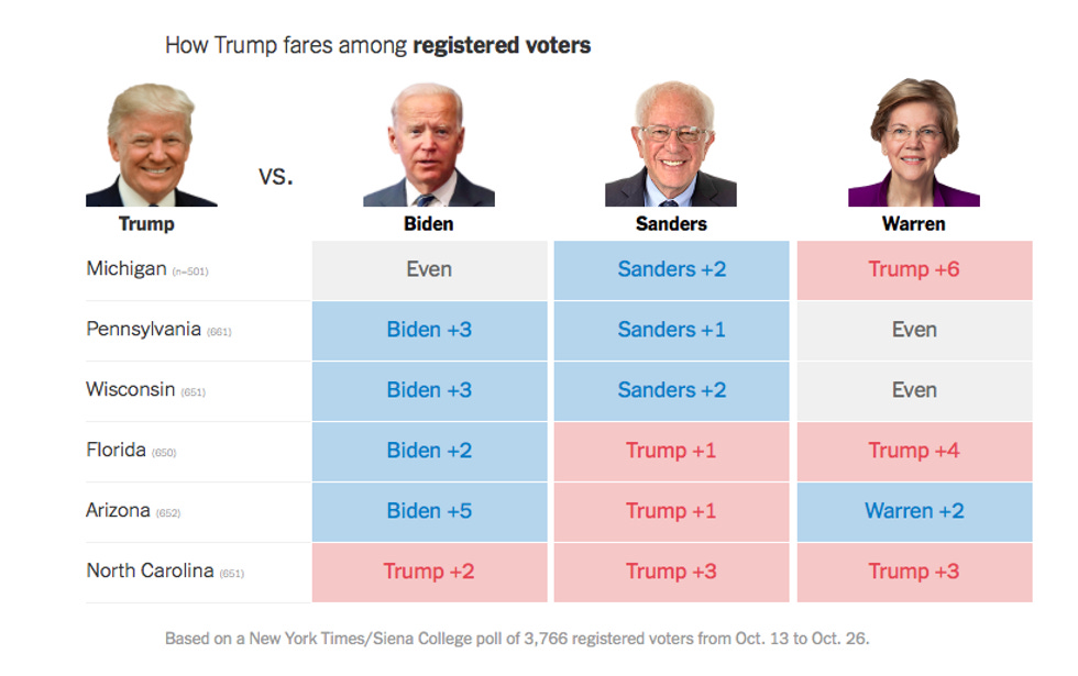 It's weird that Gerson singles out Warren's performance in the Times /Siena survey. Joe Biden, our electable white knight, is within the margin of error with Trump in these states. He's only doing a point better in North Carolina than Sanders and Warren, which is interesting. Those two northeast libs were supposed to repulse black Southerners like unseasoned greens. This very same poll, by the way, had Clinton a full 7 points above Trump in Pennsylvania just a week before the election. Trump wound up carrying the state. This doesn't mean that polls are doo doo, but maybe moderate Democrats should stop holding them up as conclusive proof that so-called "far left" candidates are electoral poison. I'm not a big Sanders fan, which I'll express by not voting for him in the primary. I don't need to cosplay Cassandra about his chances in the general election.