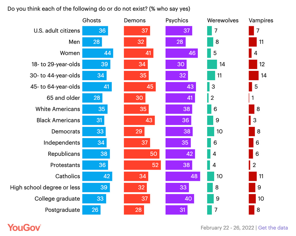 Perhaps even more disturbingly, Democrats (10 percent) are more likely to believe that werewolves exist than Republicans (4 percent). That concerns me, although it perhaps has more to do with the fact that belief in werewolves seems to skew younger, with 14 percent of 18- to 29-year-olds believing and only 2 percent of those 65 and older believing in them. Also Democrats are slightly more likely to believe in werewolves than in vampires, and what the hell is that even about?