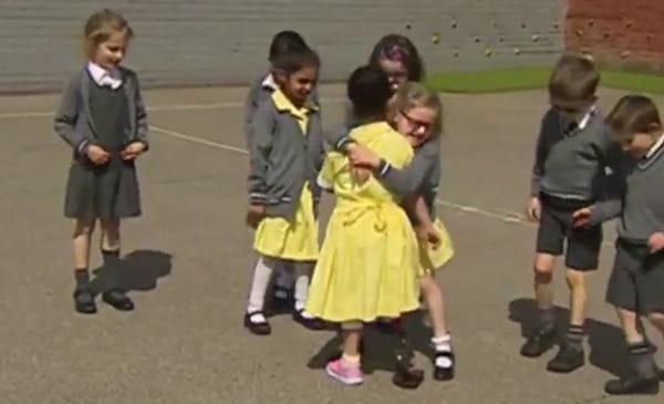 We're not sure if our favorite part of the video is her one friend rushing to walk hand-in-hand with her, or the little friend who almost knocks her over with a big awkward kid hug, or the running around to show she can run around, or the synchronized high-kicking with her first little pal. All of it.