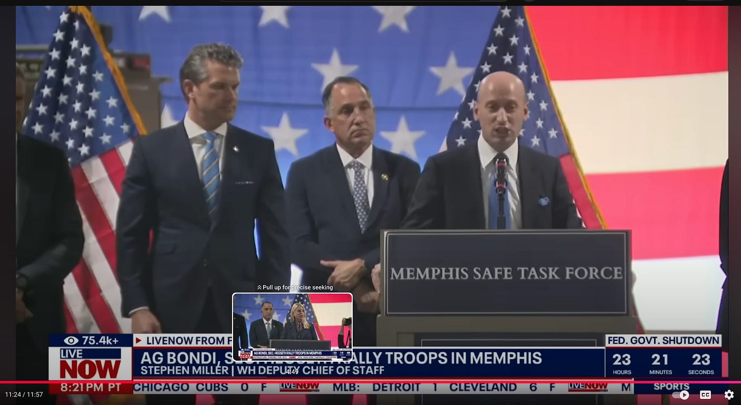 Attorney General Pam Bondi, Secretary of War Gulf of America Pete Hegseth, and the boss of the entire Hitler 2.0 administration, the one they say is really calling all the shots, Stephen Miller, landed in Memphis yesterday to give the troops a pep talk.