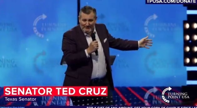 Charlie Kirk’s Turning Point USA circle jerk is still going on, and oh boy, we have to imagine that they’re bringing out the good drugs at this point. Or maybe this is happening with everybody stone cold sober, we don’t know. But the point is that Senator Ted Cruz got up there yesterday and made everybody think about his penis. We have to imagine that even in a room full of social lepers like Turning Point USA college students, that wasn’t pleasant.