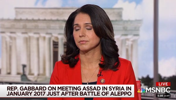 Kasie Hunt started the questioning, because she was just curious about that time Gabbard met with Assad, and how much Gabbard really supports him, which is kind of a common question. Gabbard traveled to see him in 2017, and weirdly, she came back trumpeting the very same propaganda about the Syrian civil war Assad has been propagating. (And who is Assad's ally in that fight? Putin!)