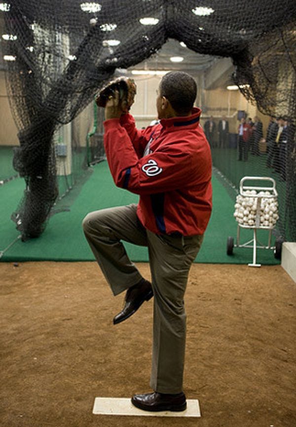 The world's most terrible criminal, Barack Obama, can't even honor America when he throws the "first pitch" at the baseball game. Here is scandalous photographic evidence posted by the White House photographer on the White House Flickr website showing the war-crazed pacifist literallypracticingfor his first pitch at the Nationals' game the other night. It says right in our Constitution somewhere that presidents shall not practice in any way before they make their dismal, lame-o first pitch. [ White House Flickr / Political Wire ]
