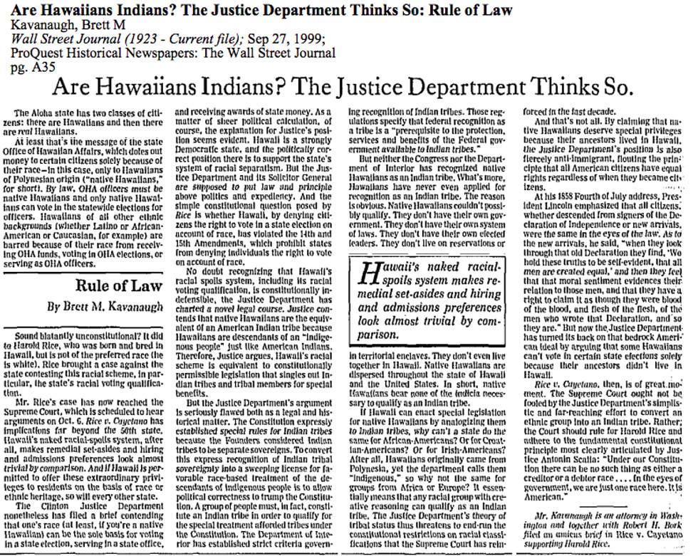On a more serious note, one of the "leaked" emails shows Kavanaugh railing against "naked racial set-asides." Hirono clashed with Kavanaugh last night over a WSJ article he wrote in 1993 ridiculing the idea that native Hawaiians should be treated as indigenous people.