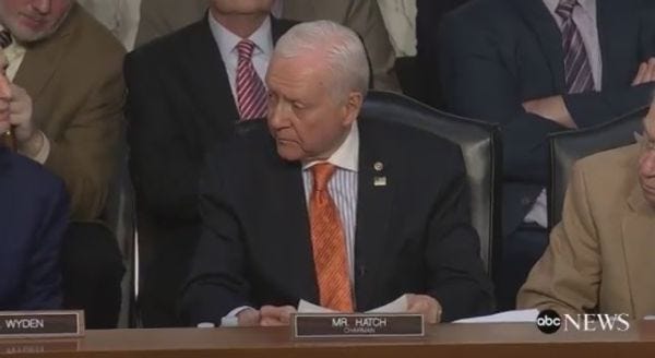 Oh? Working together? Brown jumped in, "Then let's start with CHIP..." Starting with CHIP would make sense; Hatch actually originally sponsored the children's health insurance program across the aisle with one Ted Kennedy (D-Taxachusetts and also Chappaquidick as you doubtless have been hearing A LOT this week). But no, Hatch did not want to start with CHIP. He wants to start with tax cuts for corporations and the wealthy. But everything Hatch has ever done has been "for the benefit of people in this country." Especially the rich ones, but his heart is in the right, place, doggone it!